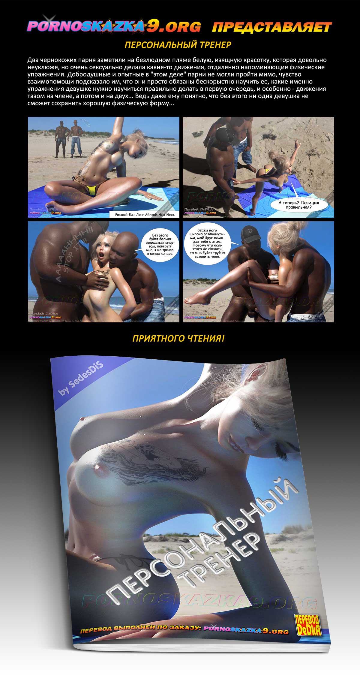 Порно комикс «Персональный тренер.» Два чернокожих парня заметили на безлюдном пляже белую, изящную красотку, которая довольно неуклюже, но очень сексуально делала какие-то движения, отдаленно напоминающие физические упражнения. Добродушные и опытные в «этом деле» парни не могли пройти мимо, чувство взаимопомощи подсказало им, что они просто обязаны бескорыстно научить ее, какие именно упражнения девушке нужно научиться правильно делать в первую очередь, и особенно — движения тазом на члене, а потом и на двух… Ведь даже ежу понятно, что без этого ни одна девушка не сможет сохранить хорошую физическую форму…